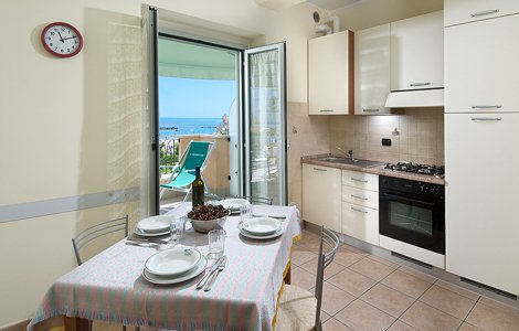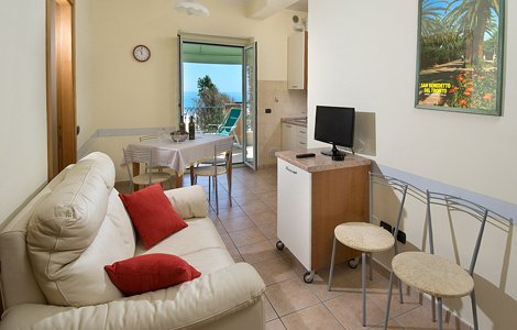 Appartamenti dotati di balcone vista mare con tavolo e sedie. Dispongono di soggiorno con angolo cottura, frigorifero, portone blindato, video citofono, TV Sat., aria condizionata. Alcuni appartamenti sono dotati di due camere matrimoniali e doppi servizi.